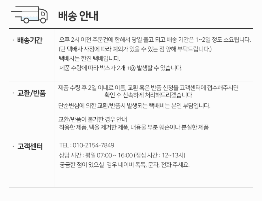 - 상품 하자 또는 오배송의 경우 판매자가 배송비를 부담하며 교환 또는 반품 처리됩니다